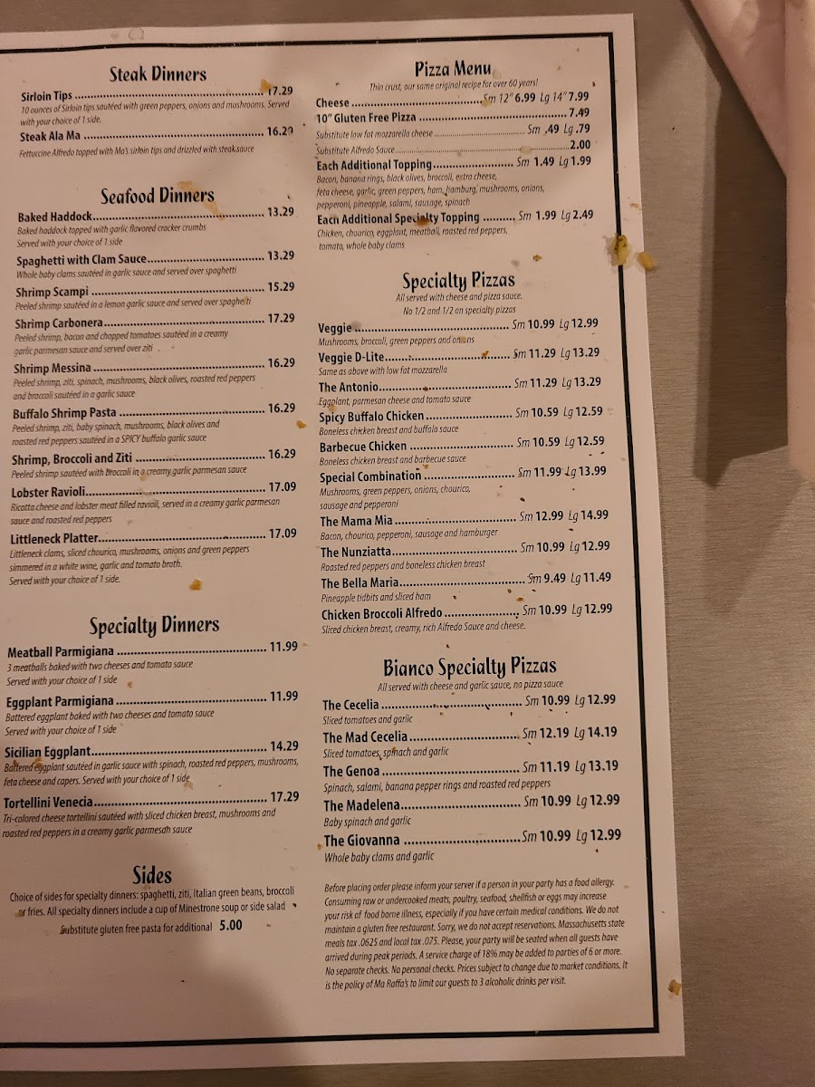 The menu features traditional favorites such as lasagna served with tomato sauce, flavorful baked ziti, and a variety of thin-crust pizzas including the BBQ Chicken and Pepperoni. For those seeking a lighter bite, salads like the Antipasto Salad and starters like Fried Ravioli offer a pleasant balance. Soups like Minestrone provide a comforting choice, especially during cooler months.